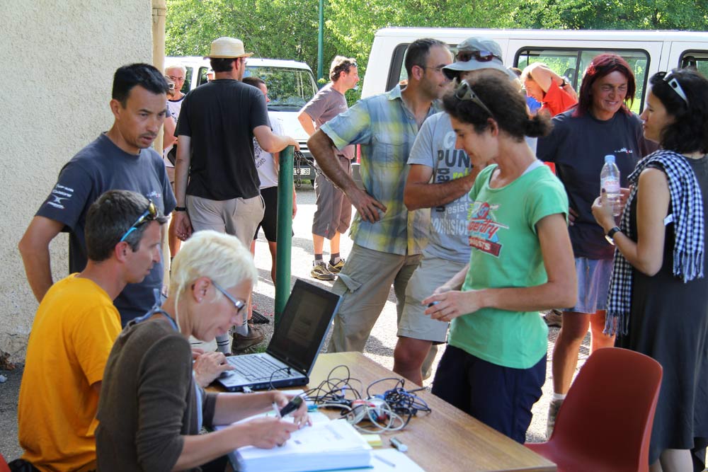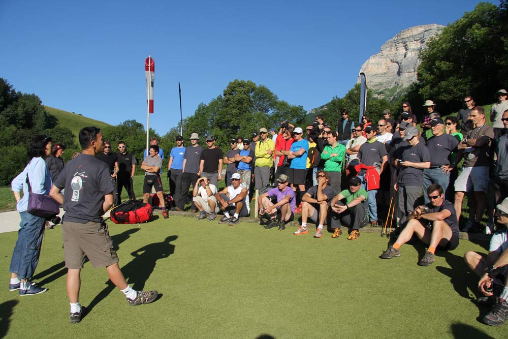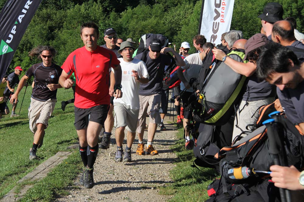 Competitors run to grab their kit from their supporters. Then get round the corner and stop to decide what to actually do, given the strong winds on Dent de Crolle
