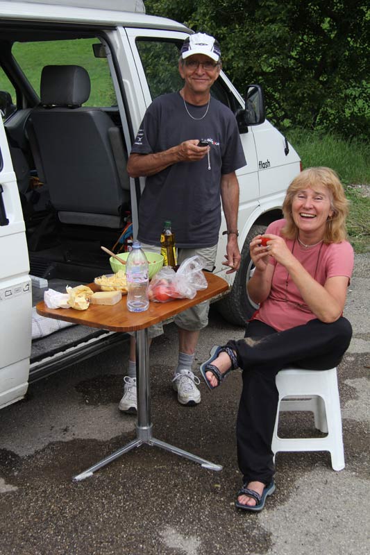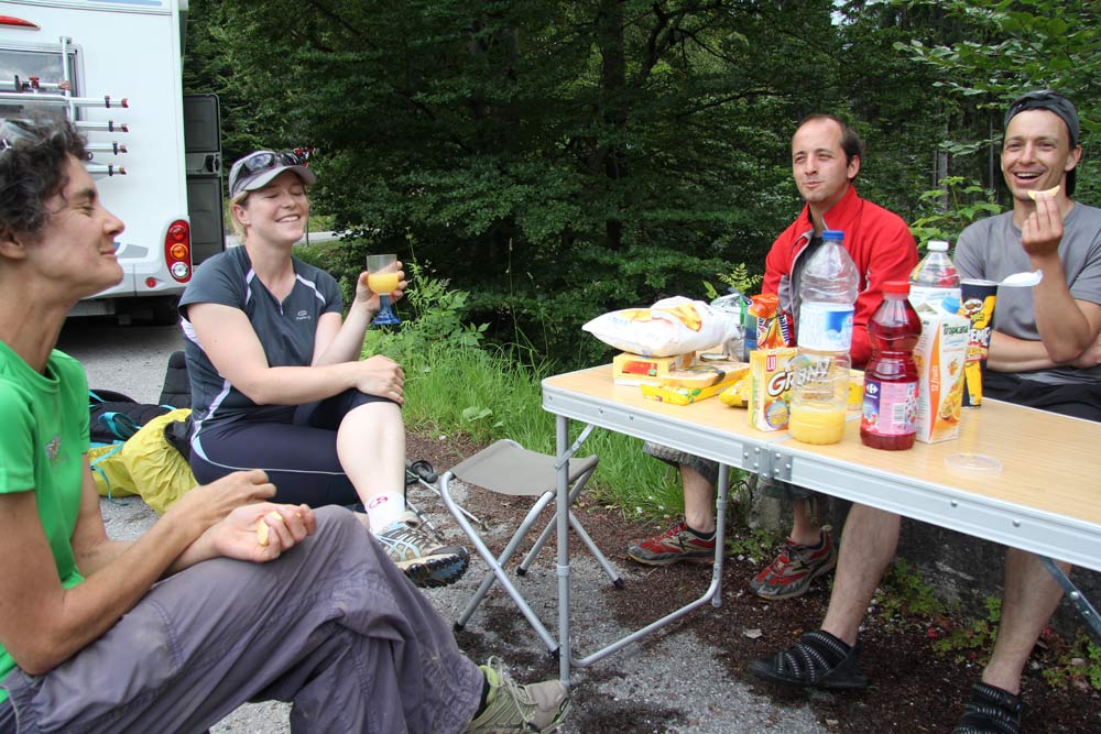 Just outside La Clusaz Jonathan makes an amazing roadside picnic, and we have a break with Al and Allie