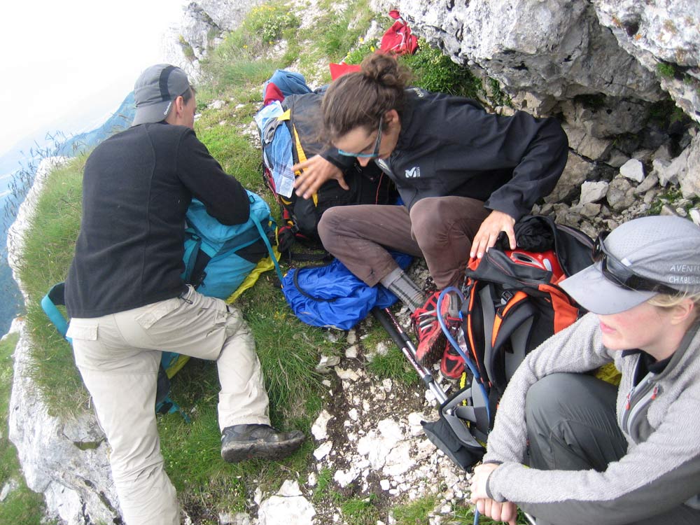 Gabriel, Sammy and Aude sheltering from the wind at the top of Colombier